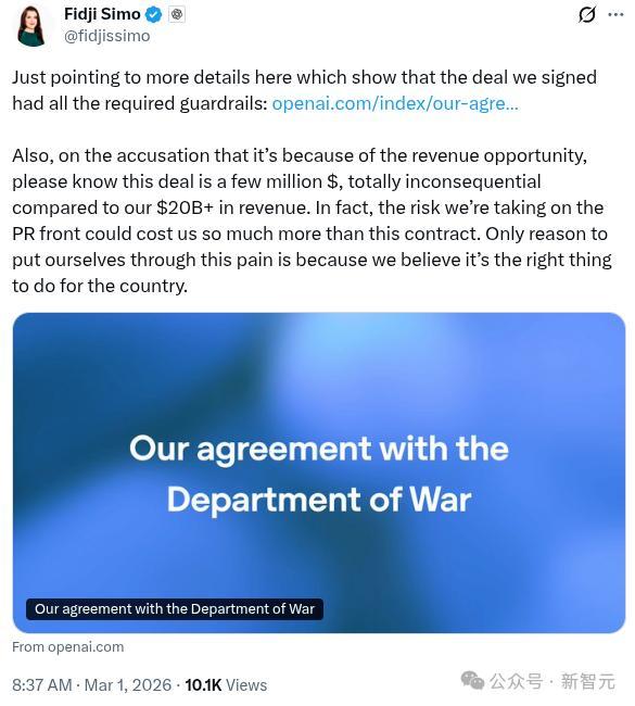(OpenAI与美国国防部的交易金额)也就几百万美元,与我们200多亿美元的年收入相比微不足道,绝对不值得为此引发公关风波。 我们这样做是因为这对国家是正确的选择,为此我们自身承担了巨大的代价,绝不是为了收入。