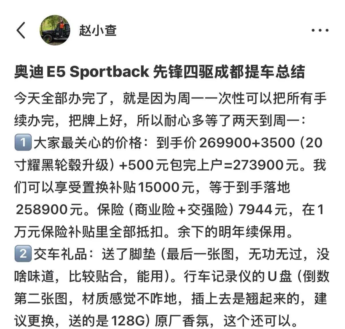 1、我们第一时间提的那台奥迪E5 Sportback先锋 quattro 版,当时裸车价为26.99万,因为选的是黑外黑内,顺势选装了20寸耀黑轮毂,加了3500元。