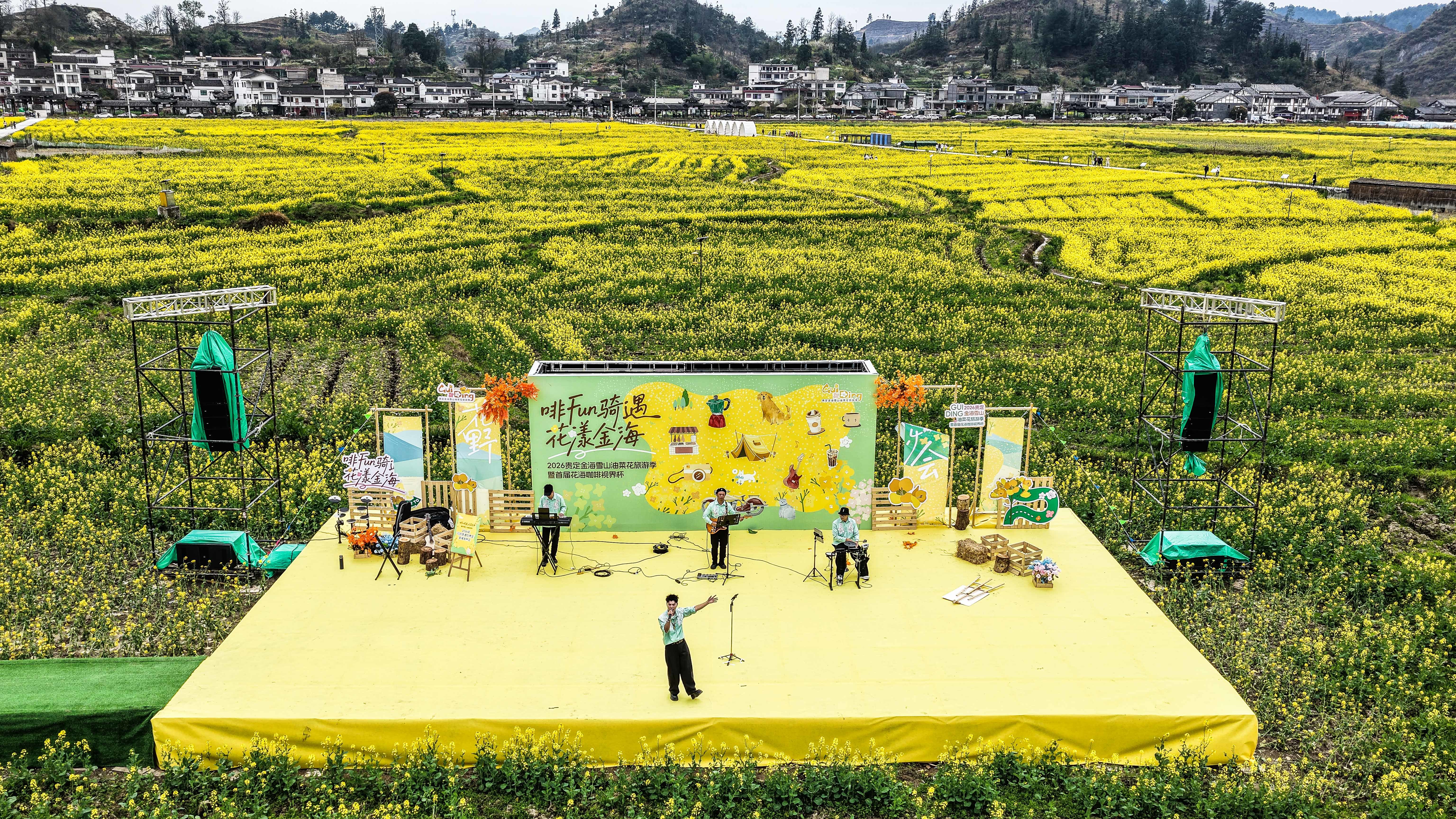 3月13日,乐队在贵州省贵定县盘江镇“金海雪山”景区内表演(无人机照片)。新华社记者 陶亮 摄