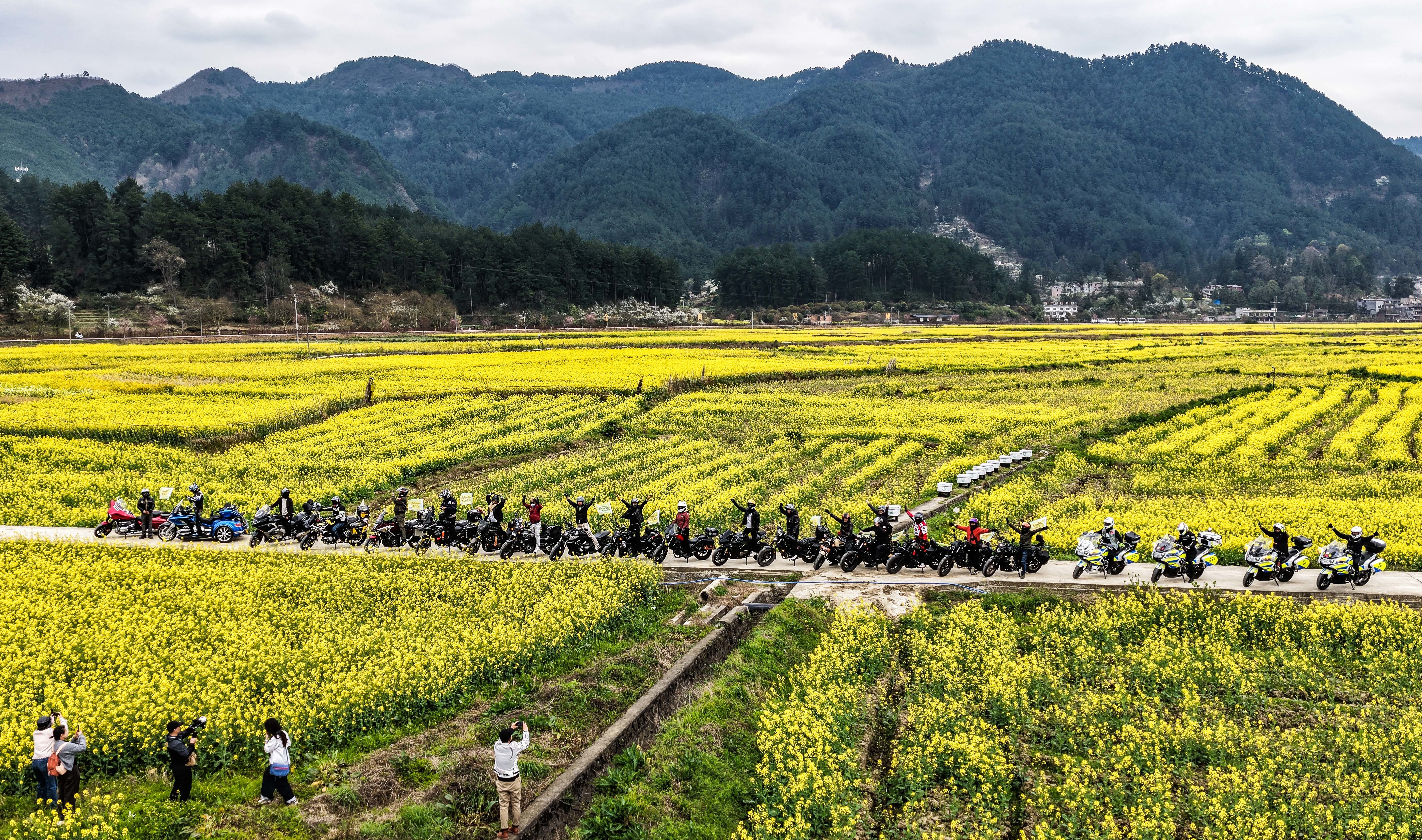 3月13日,摩旅队伍在贵州省贵定县盘江镇“金海雪山”景区内集结(无人机照片)。新华社记者 陶亮 摄