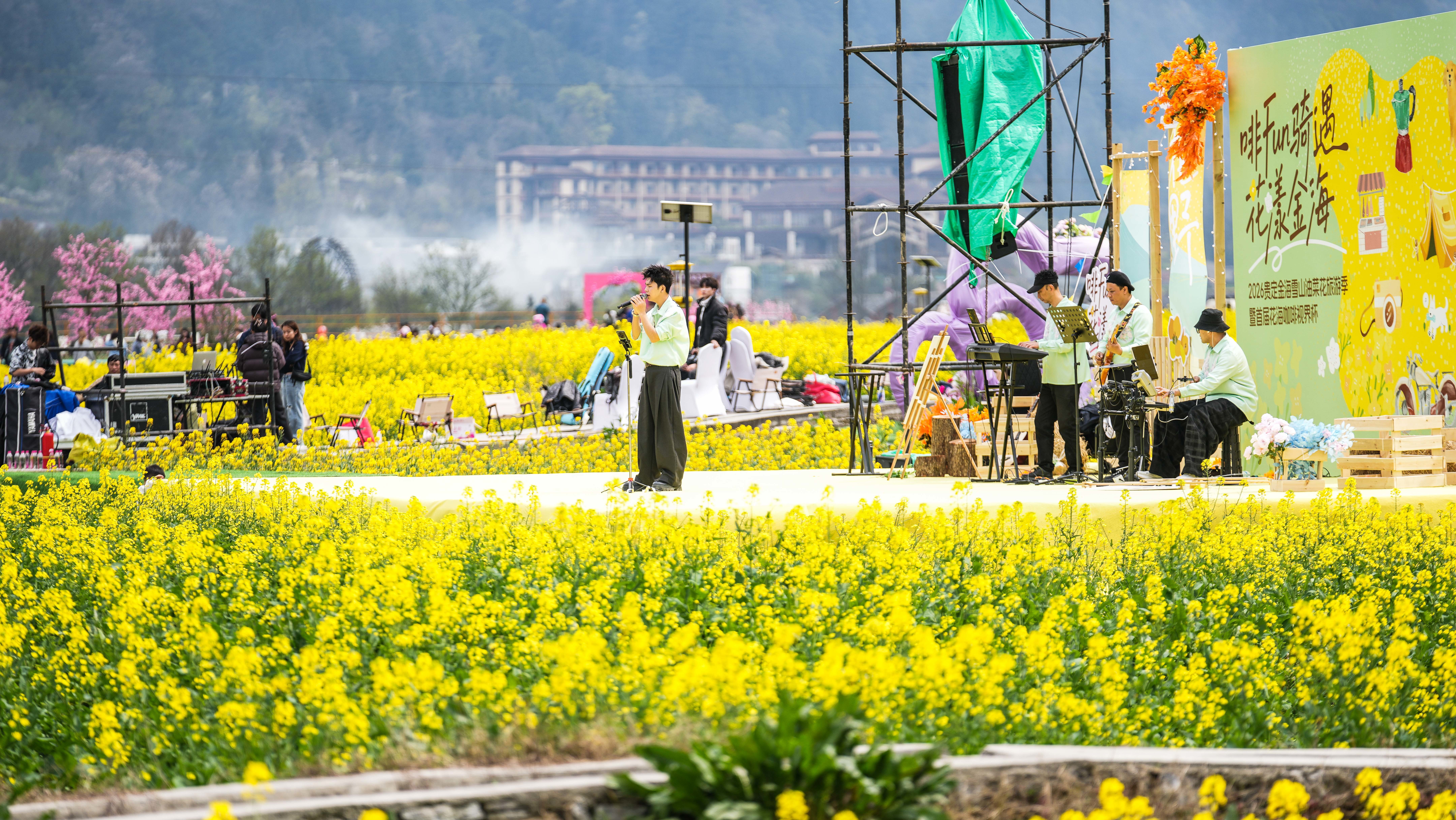 3月13日,乐队在贵州省贵定县盘江镇“金海雪山”景区内表演。新华社记者 陶亮 摄