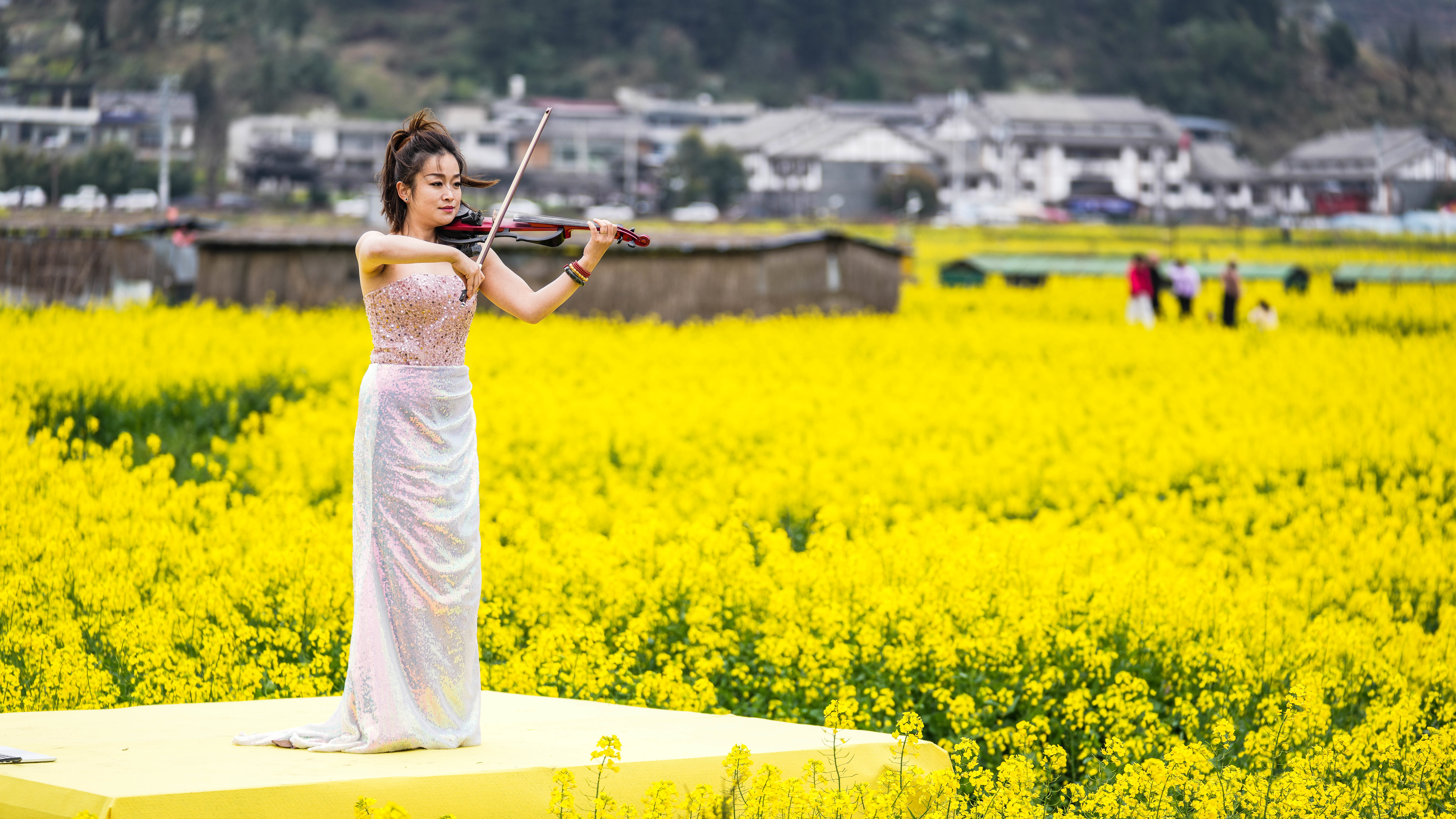 3月13日,演员在贵州省贵定县盘江镇“金海雪山”景区内演奏小提琴。新华社记者 陶亮 摄